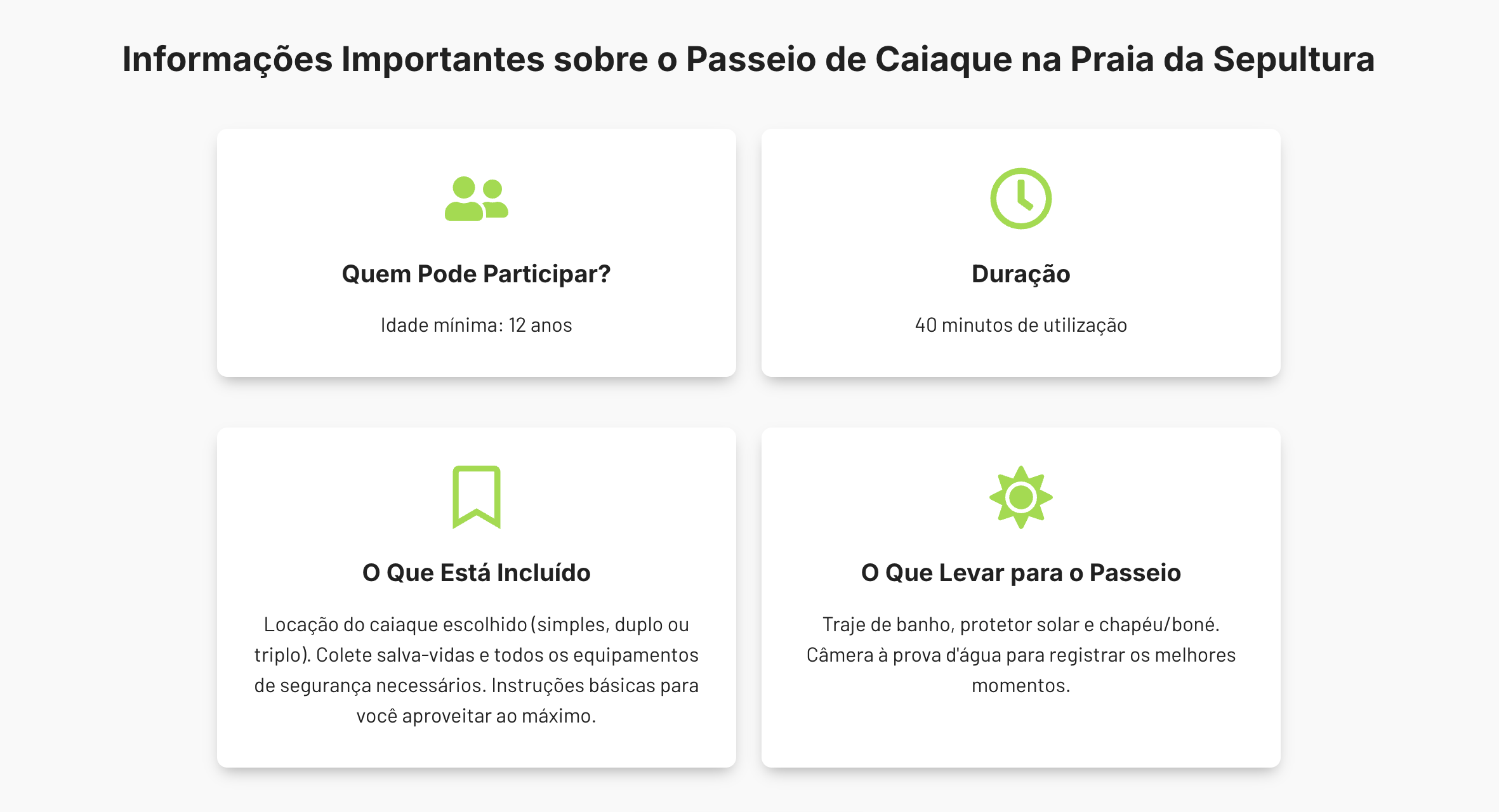 Aventura para Toda a Família: Com opções de caiaques para todos, desde o aventureiro solo até a família completa, garantimos diversão e segurança para todas as idades.